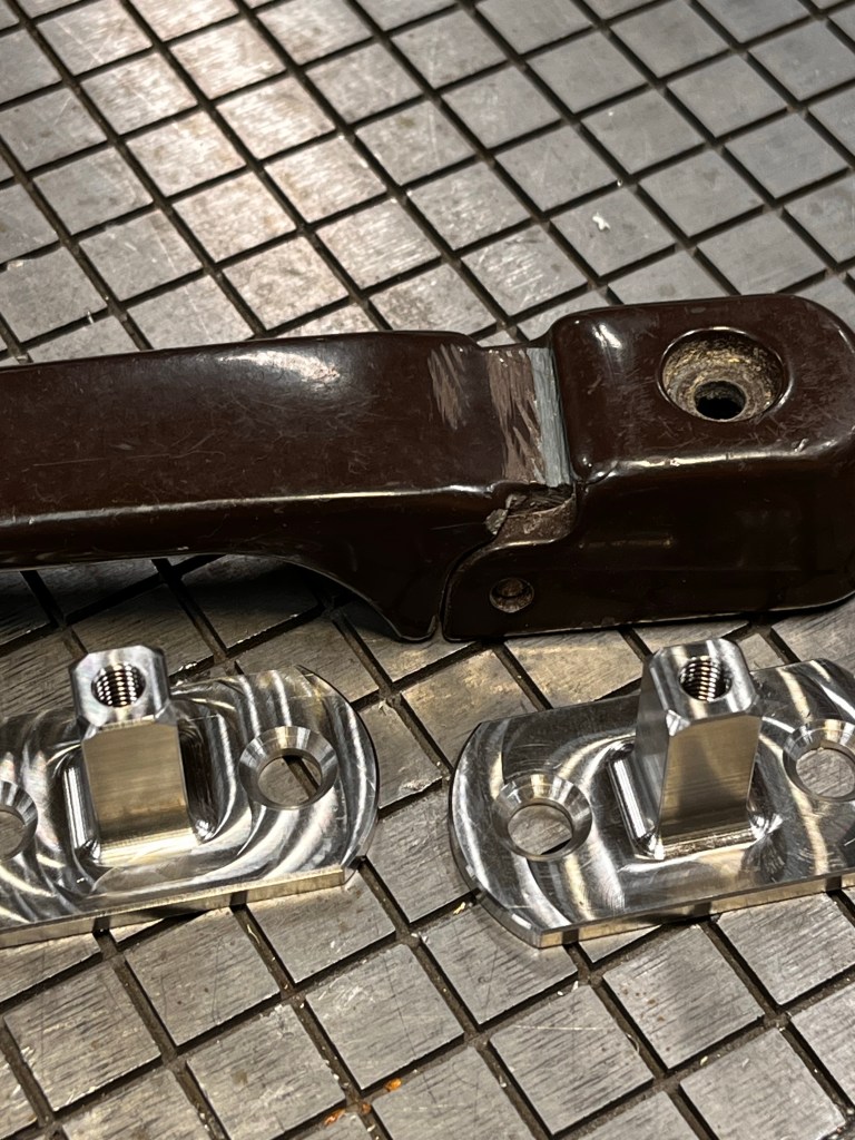 Pics show some of my attempts, including 3d prints. And my final attempt, the “good enough, I’m not gonna waste any more time” , powder coated and on the door.