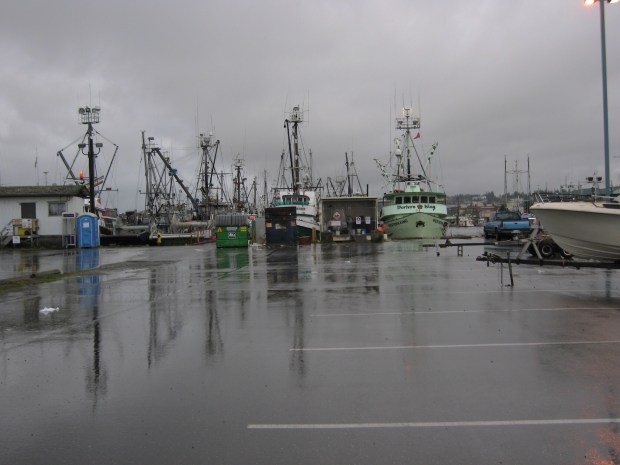 Rain and a fairly high tide makes it look like the boats can come right on the parking lot.