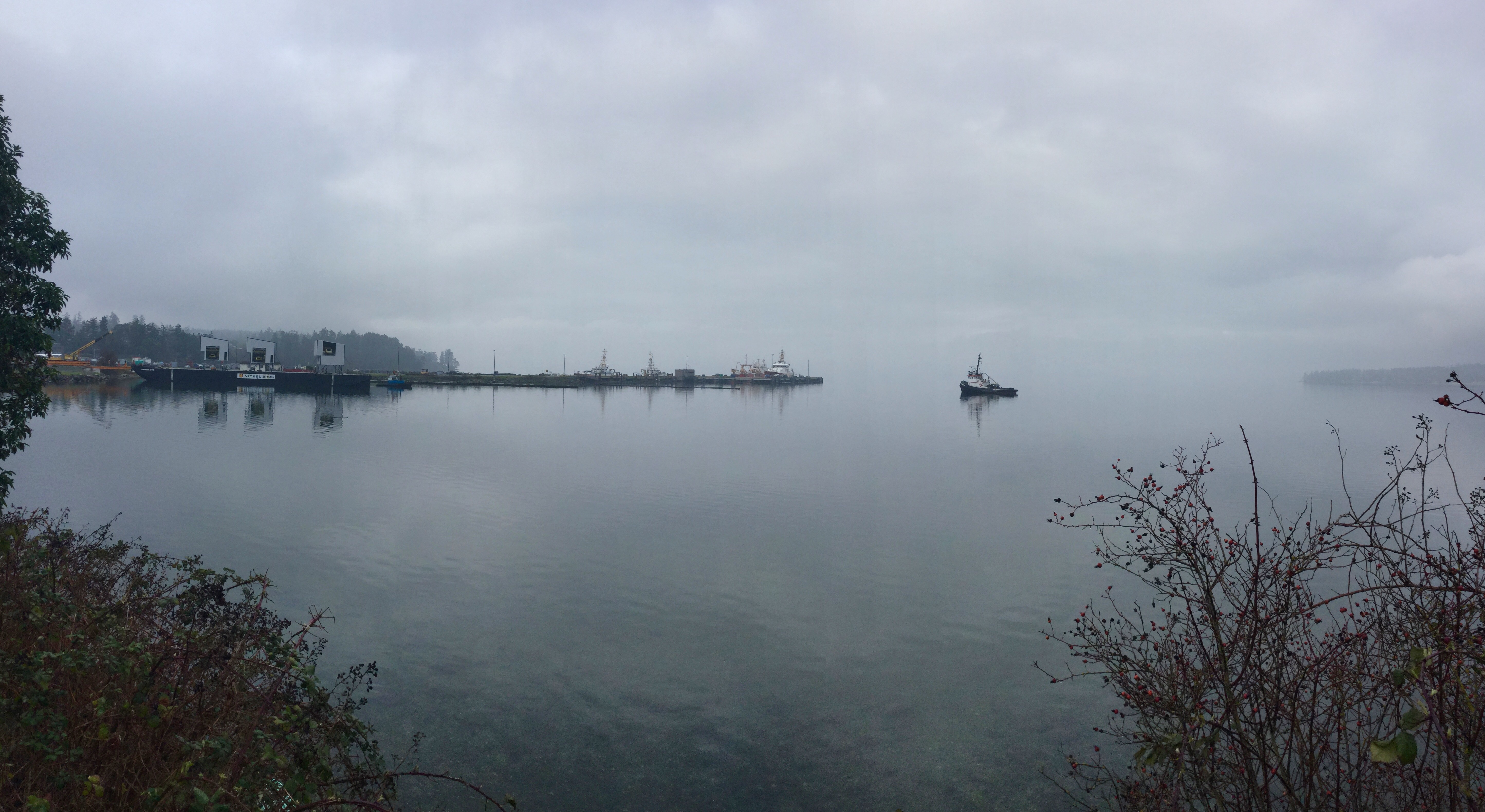 ther’s a company near Sidney that builds fairly large industrial mechanisms, pulp mill and coal conveyor parts for example. They ship the parts out on barges that come in on high tide at Patricia Bay. The parts are transported across the peninsula via the airport’ at night of course. One morning a I took this picture, you can see the conveyor heads at the dock. The water is so still.