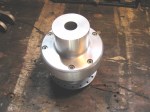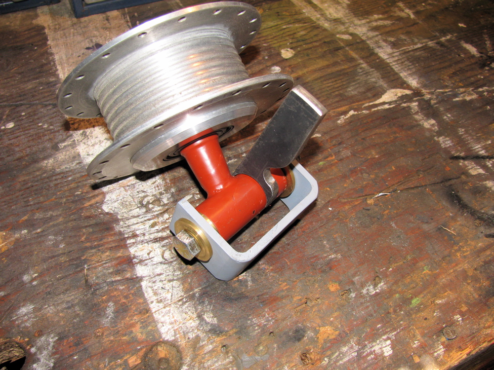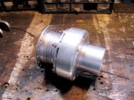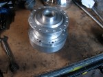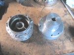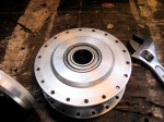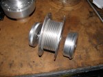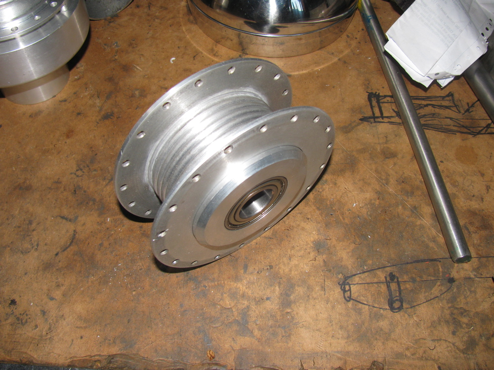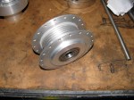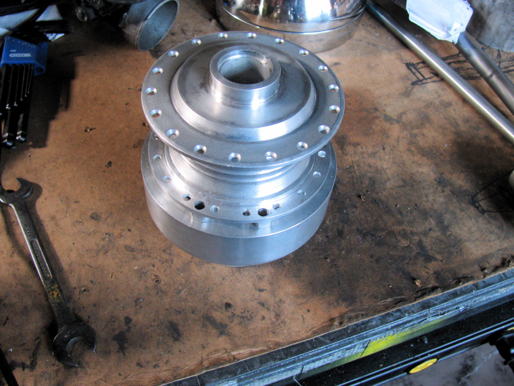 Hubs are Motobecane moped hubs, I took the spokes off and machined them a bit. One front hub is shown, with machined bearing housings. The rear fixed hub is shown, its the one with the overbuilt hub adapter. Lots of aluminium shavings when I did that one.