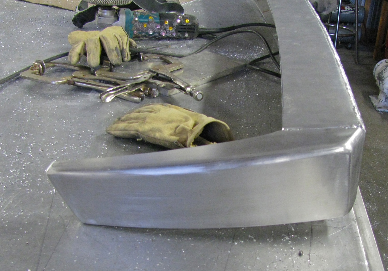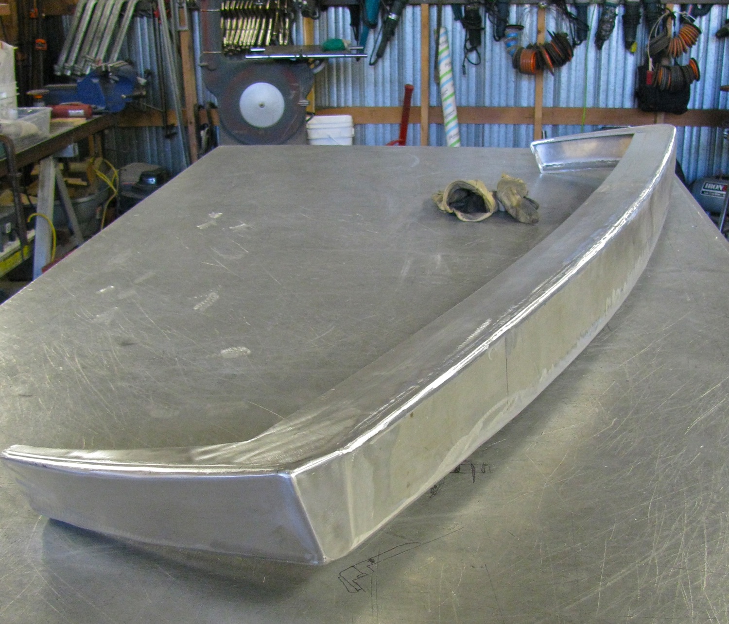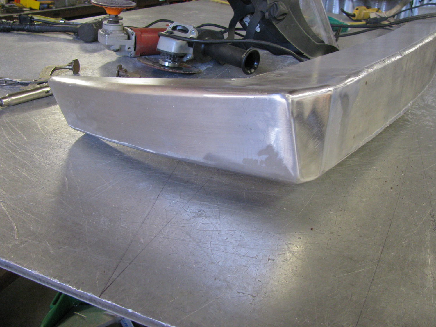 A little progress made on this project. Made up a more or less matching end cap and also did some preliminary grinding out of the welds. What a chore this way of making a bumper this is. You understand don’t you, that this is me making it up as I go along, modelling (I can hardly say sculpting can I?) a bumper out of aluminum plate. Once I get a shape that I like and that works then I can take measurements and think about how you could make one easier and faster.