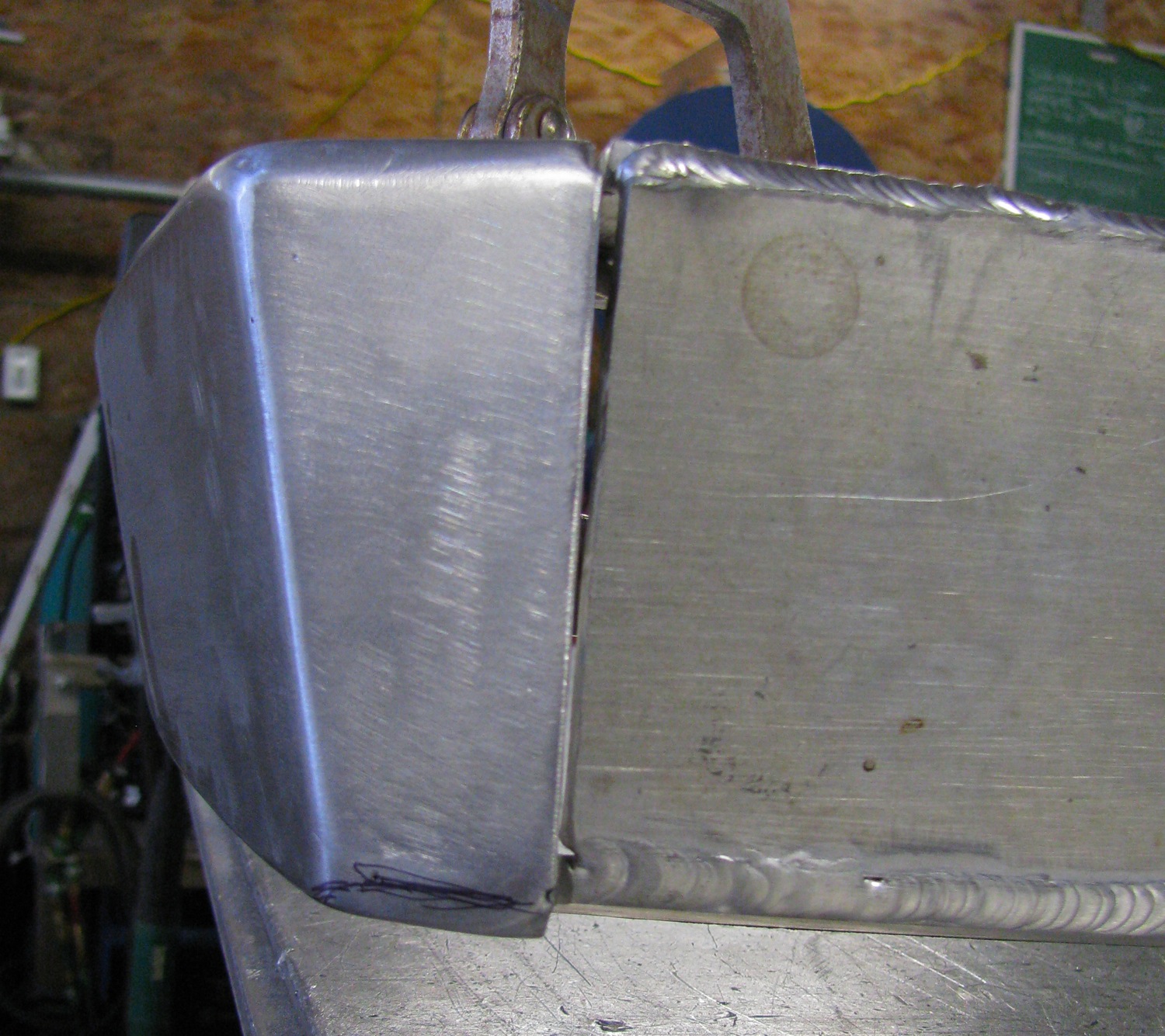 I have to be clear and say again that I’m winging it. I’m doing in aluminum what I should be doing in cardboard or thin plywood. So to fix the blunder, I cut the endcap up a bit, angled the bottom plate to match the bumper bottom plate, added another filler piece then welded it up and roughly smoothed things over. It is a lot better now, this might be the one to keep.
