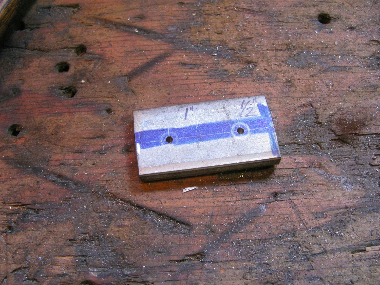 As each bit was more or less 2″ i marked out hole locations from one end. I used a blue Sharpie as lay-out dye. You can barely see the scratches of location the hole positions.