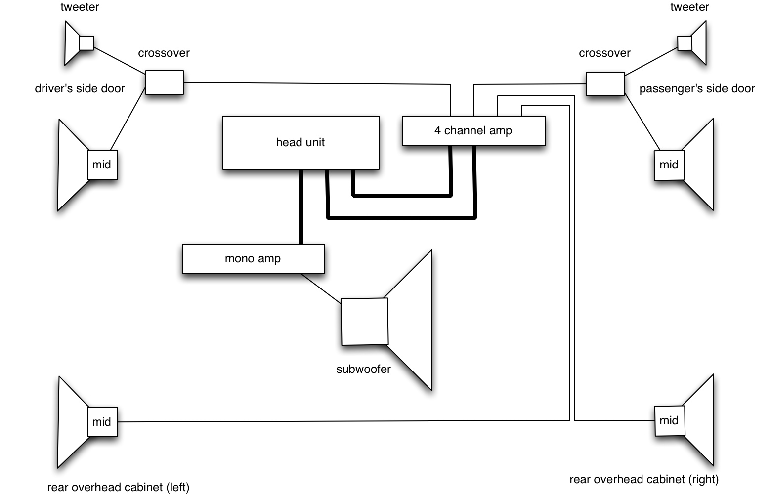 Oops, forgot, I made a quick sketch of the stereo system layout. Note the connections between head unit and both amps are via RCA jacked lines.