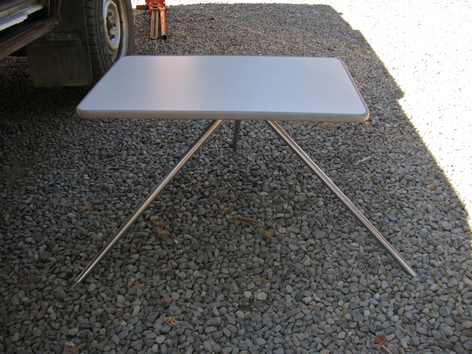 At the end of my last post, the beginnings of a trailer hitch, I showed 2 pics of my iPad Mini mounted on the dash. It was a start, a Mk I if you like, to see if I liked the position. I used some found coaxial wire, about 0.6″ diameter, aluminum wire core, polyethylene, aluminum sheath then vinyl cover. Or something like that, the point is the stuff bends and holds. It doesn’t bend back and forth forever though. Anyhoo, that and a swivel mount I made (aluminum and teflon on the moving parts), some plumbing fittings, and a pretty crudely made plate on the ashtray hole.