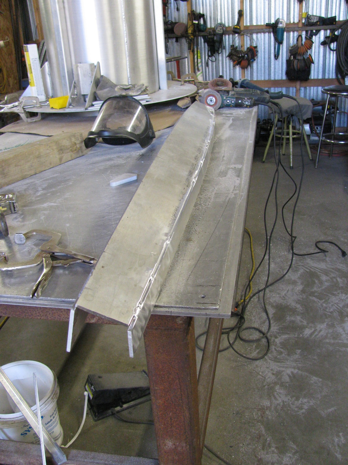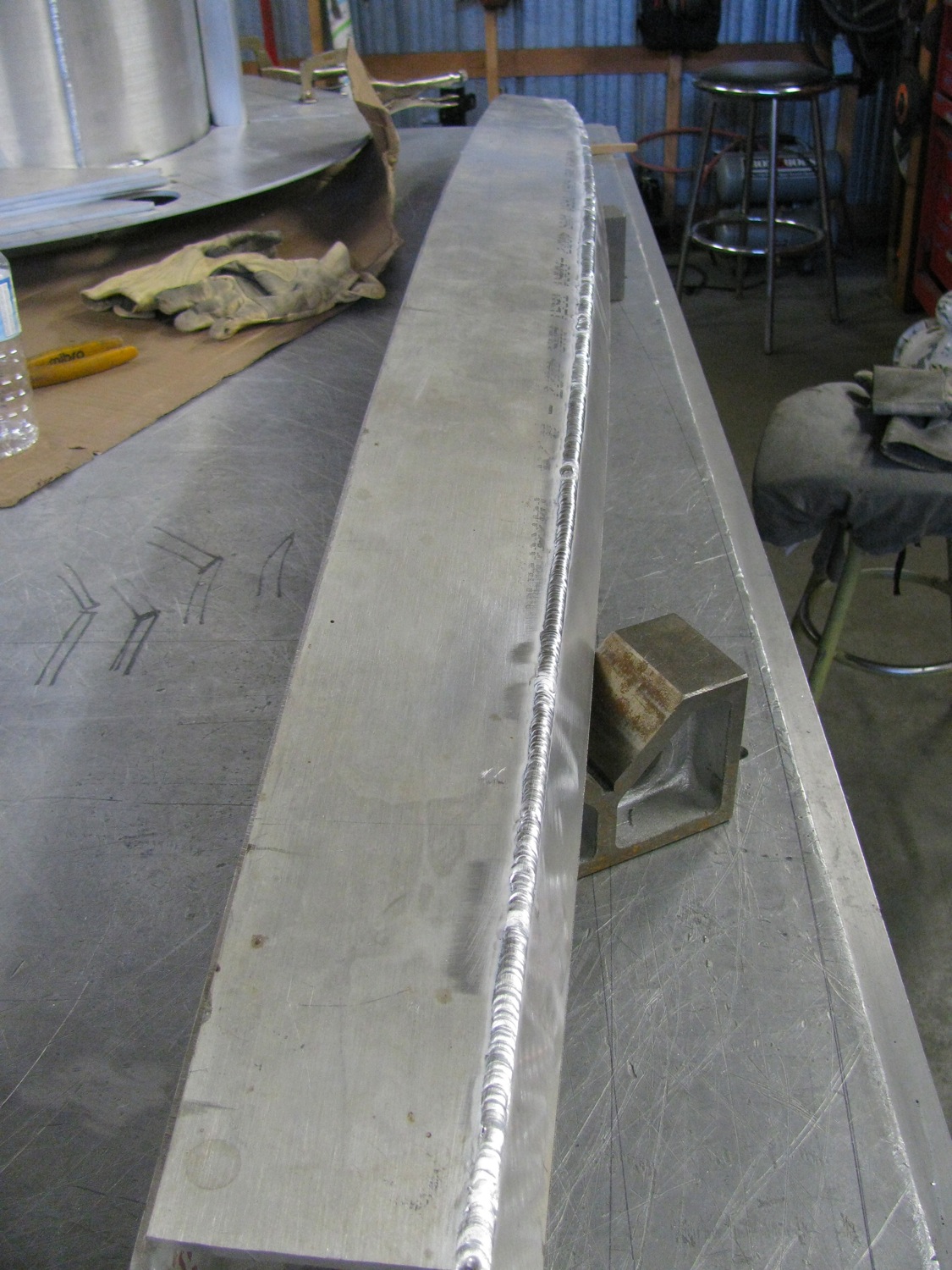 Then tacked them together. I welded a length of 1/4″ X 2″ 6061 along one side, welded out full on the concave side, then back gouged the convex side.