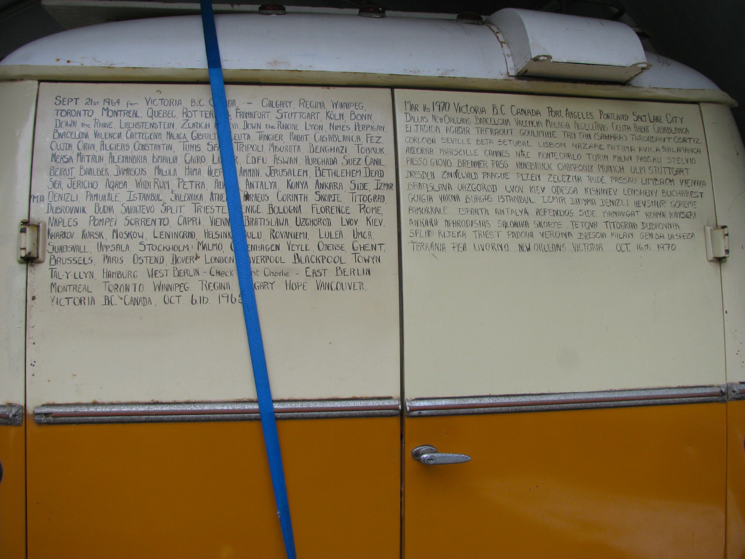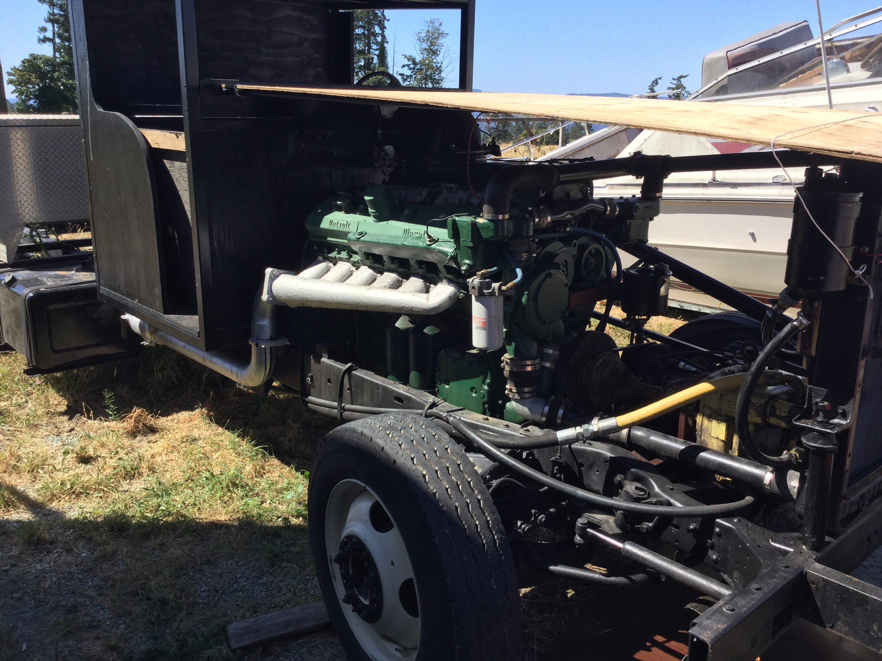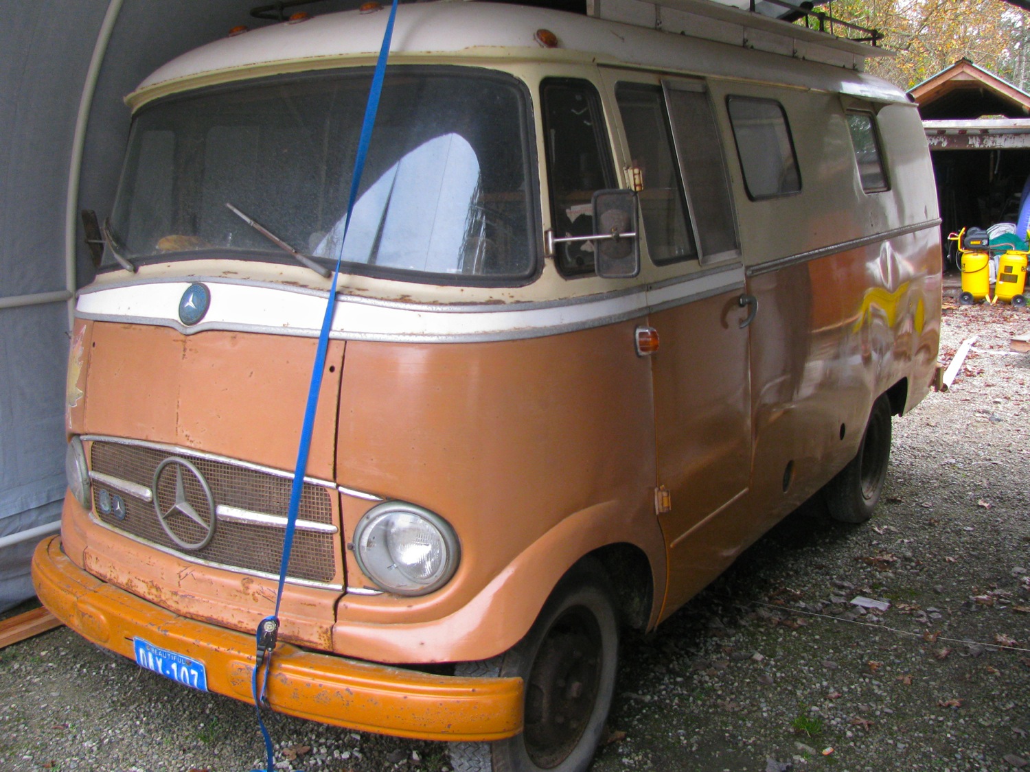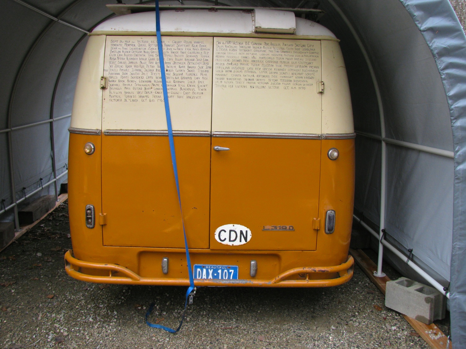This last summer my neighbour bought this MB L319D from the son of the original owners. There are many stories attached to this van, obviously, if you read the back doors.