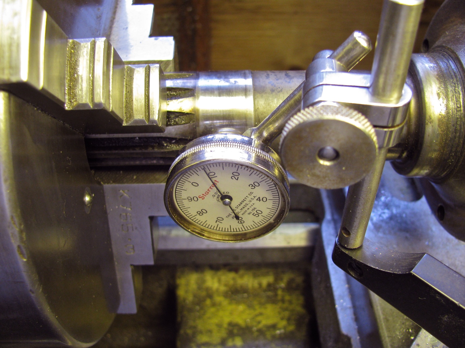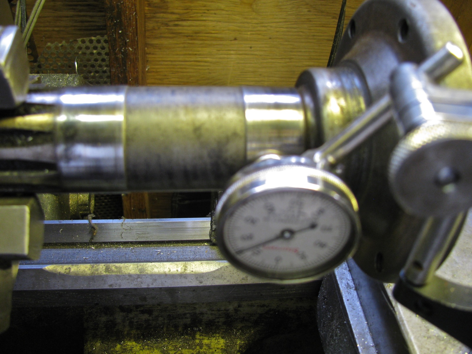 I was complaining to Phil Z. about my wheel bearing failure and he suggested I have a look at the stub axle. So I chucked it up on the lathe, holding it by the splined outboard end (was careful to have the chuck jaws positioned correctly on the splines) and then I measured a couple of things.