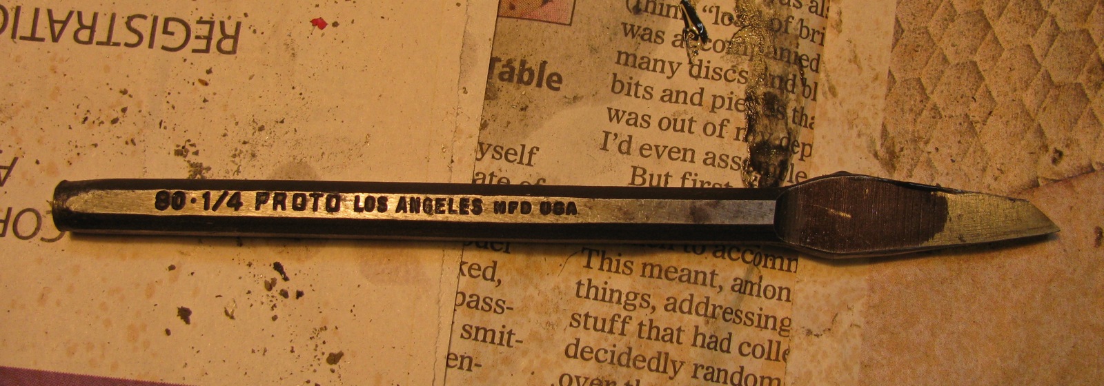 I pondered how to remove the inner bushing and came up with chiseling it out. I have this neat little 1/4″ chisel that looked like it would work.