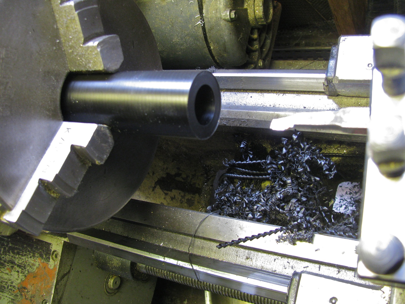 Delrin rod (1.5″ diameter but turned down a tad before this shot) and boring out to fit yoke shaft. Gotta love that chipped cutter I am using, funny thing is that it does a nice job on this plastic.
