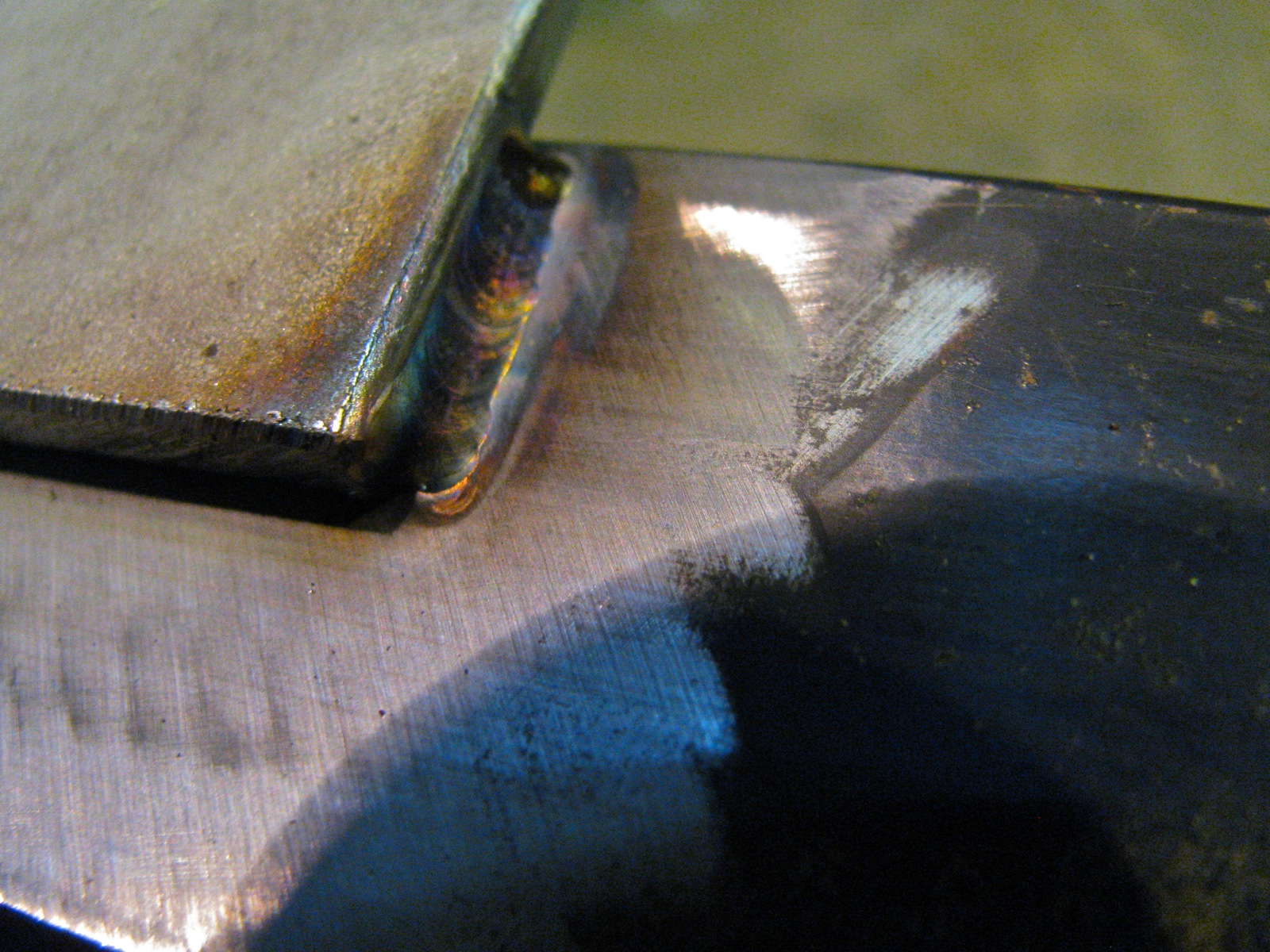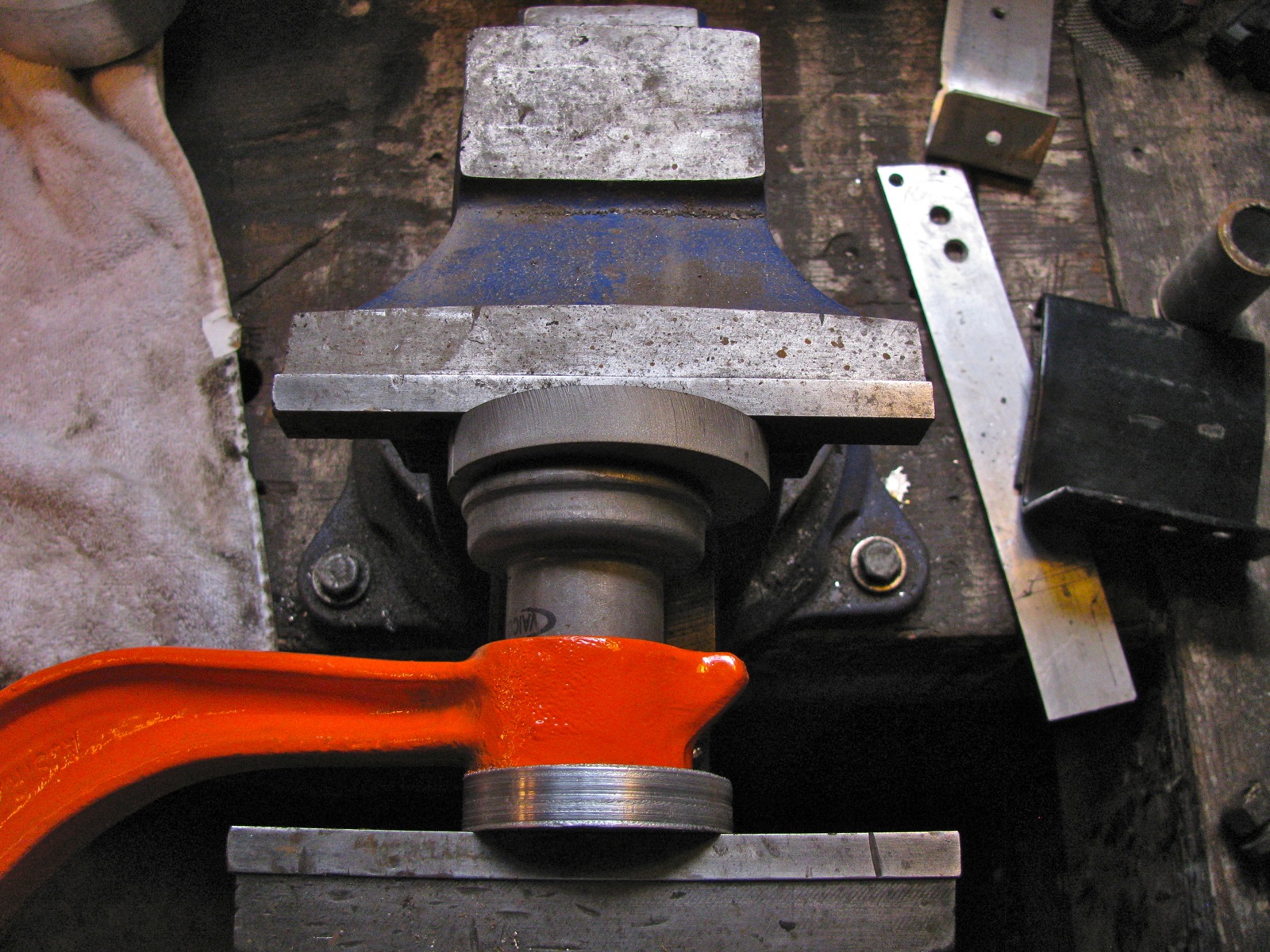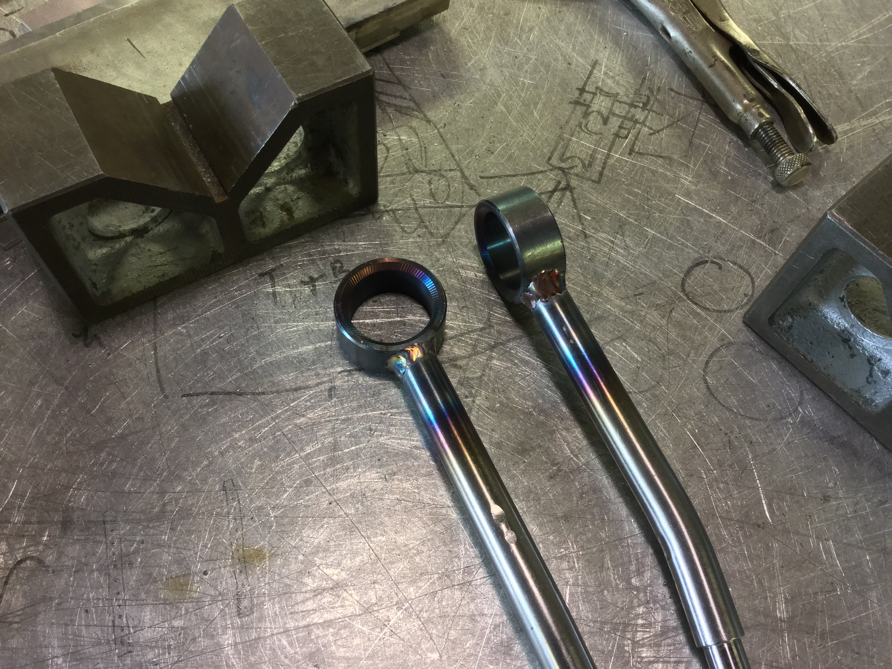 I cut them to length and ground a chisel point on the end. One root pass, then two straddling passes of weld, then I washed over with the torch. I got a bit of under cut on the rod, I could have done better but it will be strong enough. Notice the pattern on the ring portion, patented “Chattr-Mastr” finish on the bevel.