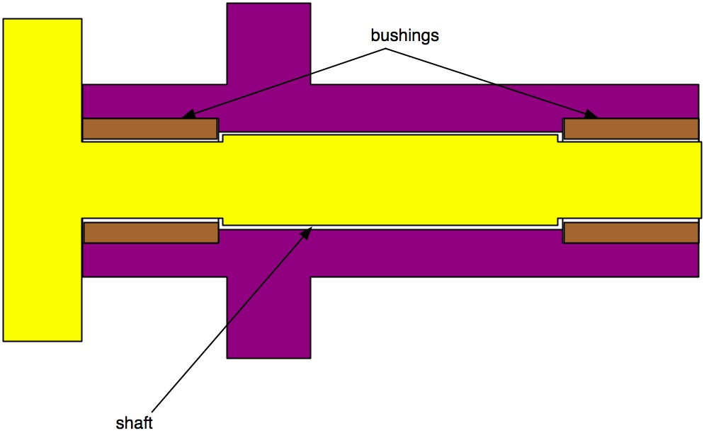 The drawings are not to scale and are meant just as sketches to get my idea across. Important thing to note is the new internal bushing will come further up the shaft, and be unsupported in old bushing area.