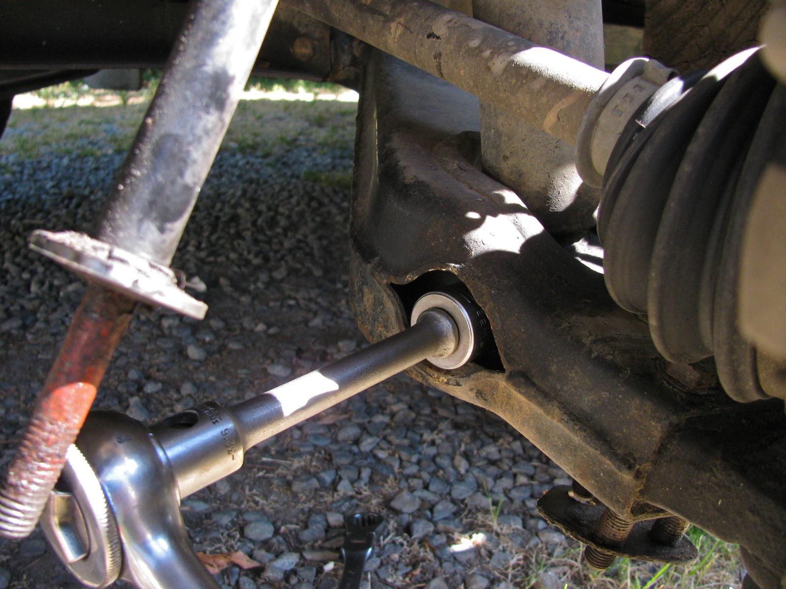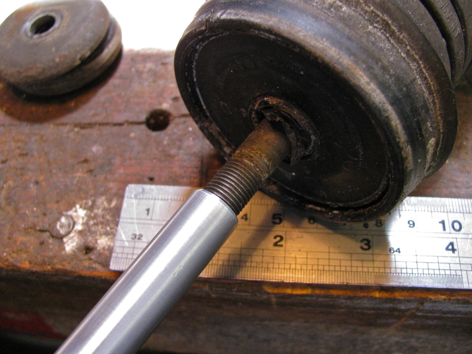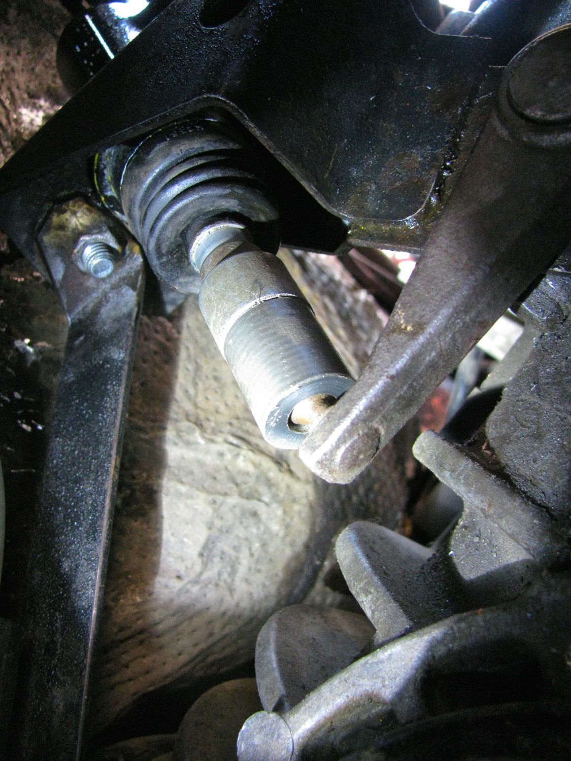 Some tubular spacers, lube, and a nut and the bushing ( already fully seated in the drop link by squeezing the two together in a vise) and hey presto, the bushing and link can be easily pushed on to the sway bar. Hey don’t rely on this pic for correct orientation of the sway bar bend to the sway bar, I was just doing a test run and didn’t take care. I did get it right in the final assembly… I think 🙂