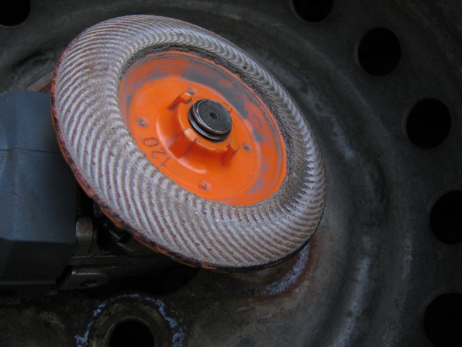 And one more thing to do. The Mercedes alloys are drilled for 12mm studs. The Vanagon uses 14mm studs. I enlarged the holes with a 37/64″ drill.