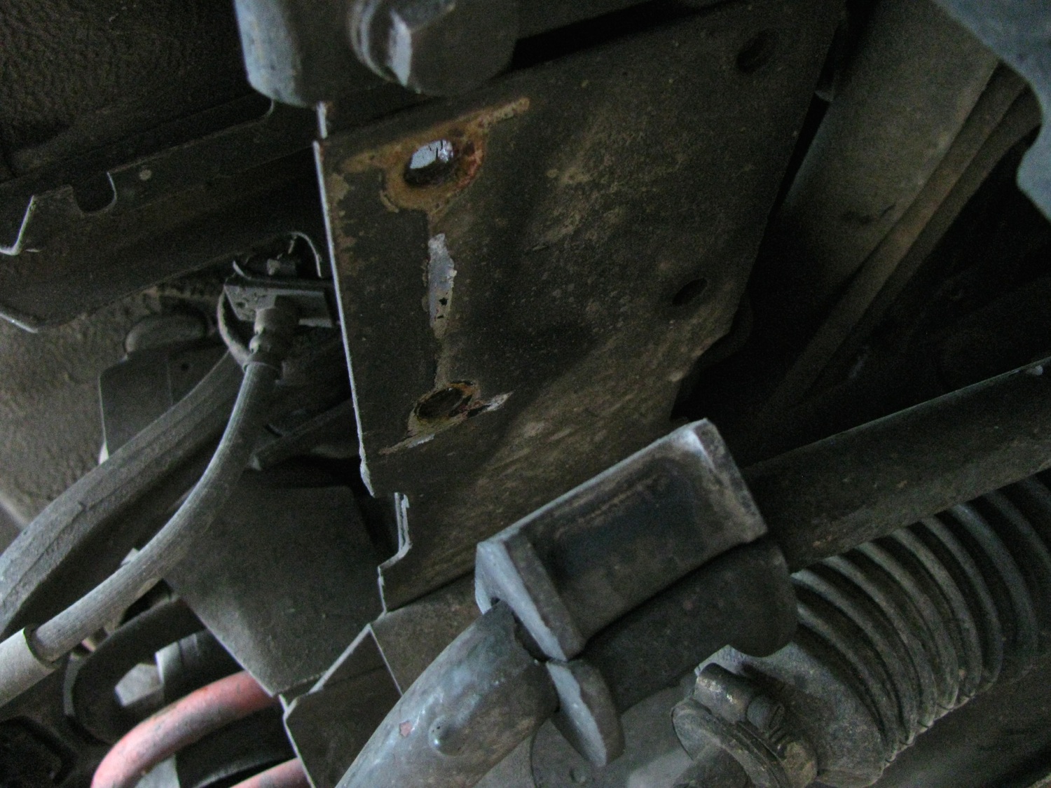 Diff lock actuator. Now this is a little bit of a bear. I found the nuts that Bentley said were welded to the bracket weren’t. Also found that the rubber sleeve covering the actuator shaft was a section of heater hose. So there was no pushing that up to drive out the roll pin, I cut the hose off. You can sort of see the cut hose in this pic.