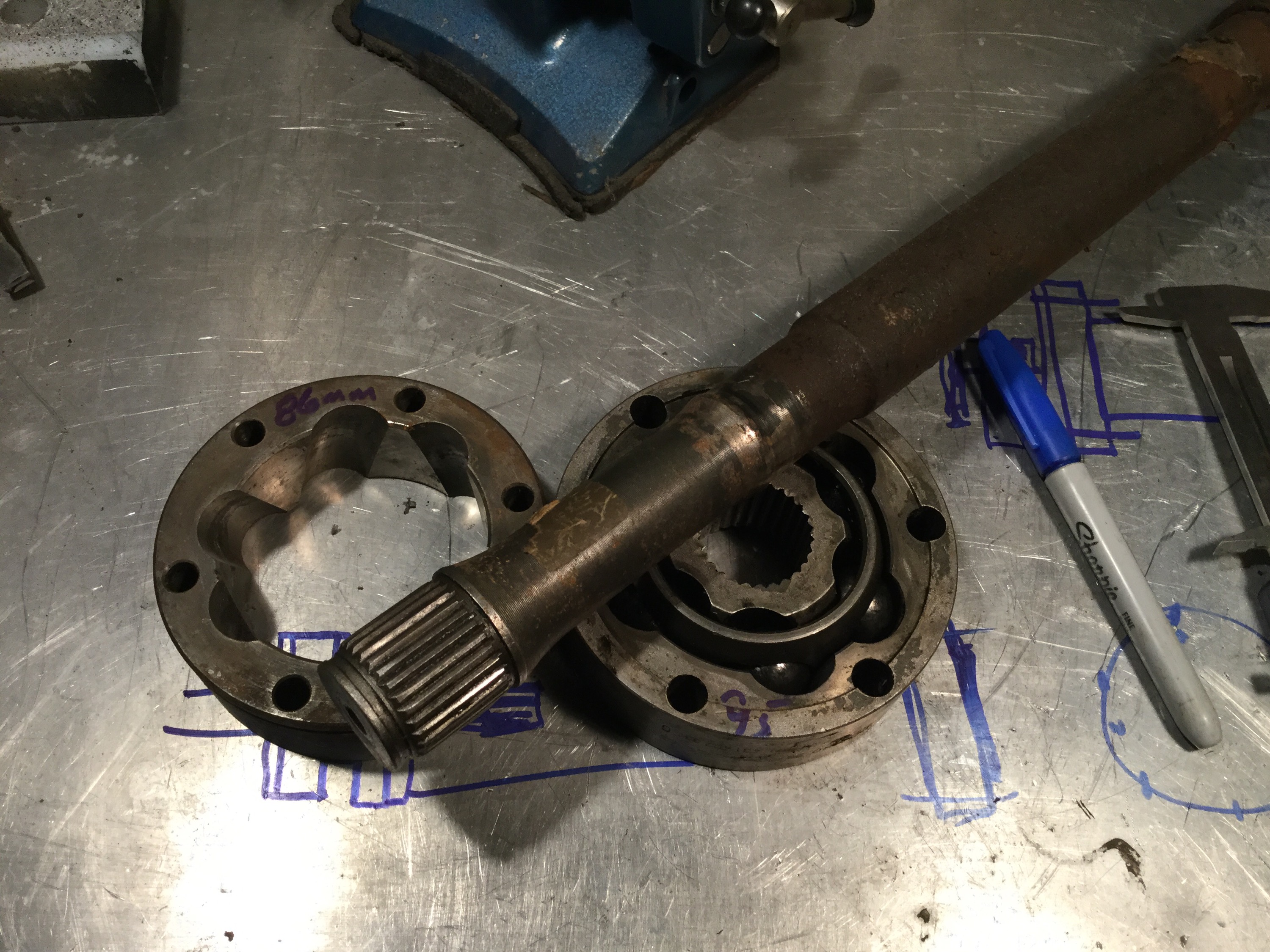 I have the half shaft for that 108mm diameter CV joint. One could imagine cutting the spline section off and mounting it to a flange that mimics the stick propshaft flange, then the slides connecting to the 108mm diameter CV joint bolted to the propshaft. I hope you understand this is all just free thinking, just for discussion.