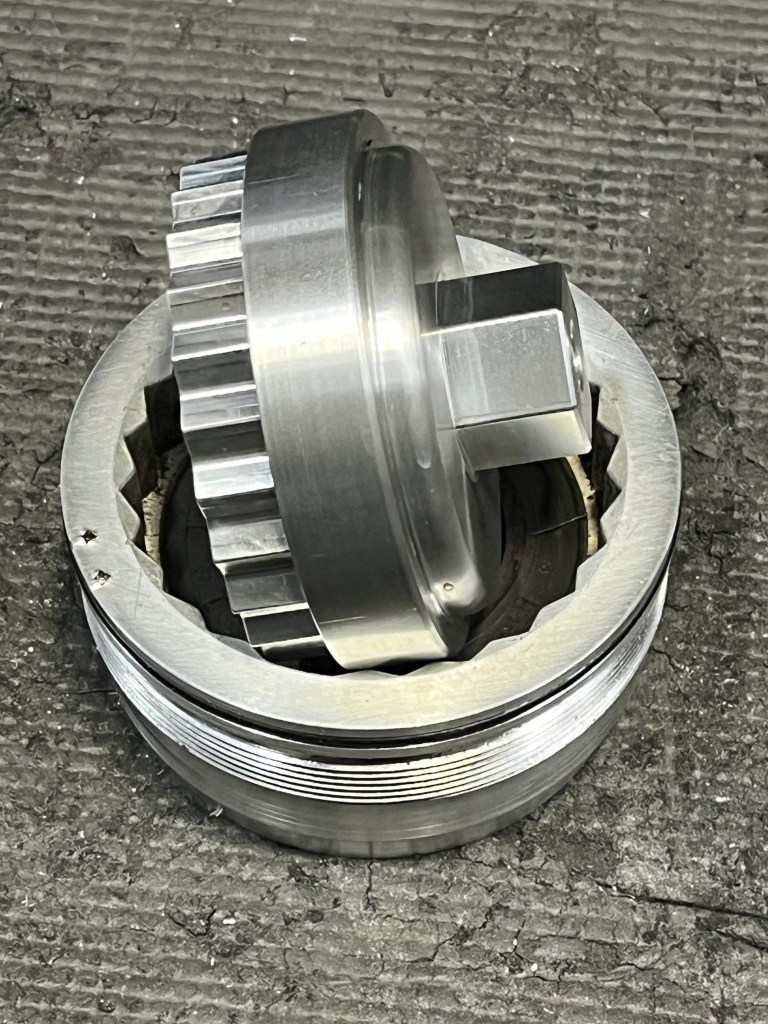To make the “practice” inner bushing, I first bored out Delrin to size, parted off, then mounted oversized bushing to yoke shaft to machine down to size. Note the outer bearing installed first. Makes you wonder if I hadn’t realized the issue with the propshaft bore yet, doesn’t it?
