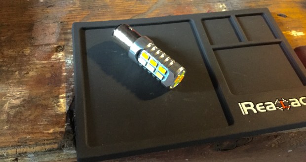 Next are led lights for the front turn signal/running light. So many choices for this light, I ended up with this unit from Banggood. Supposed to be a “switchback” light, well that’s what I thought. I was expecting the running lights (the white led elements) to go out when the amber turn signal elements are powered. And if you read the reviews you’ll see that at least one buyer had a bulb that worked that way. But both of my bulbs don’t waltz to that tune. The white elements remain on while the amber elements flash.