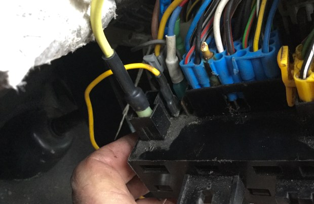 Hers the nasty connector ( I tore the plastic clip of the near side) and you see the yellow “jumper wire” to the M2 terminal. It has a bit of black heat shrink on it to give the wire a bit of stiffness, strain relief of a fashion, for the spade terminal.