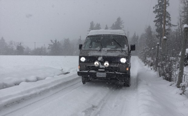 Yes, this is Simon’s latest find. 88 syncro high top. Getaway van conversion, done over on the mainland (BC). I’ll have more to say about this van and pics of the interior when Simon is finished tidying it up. It’s a good looking van, and only 82,000 km. The bored out wheels look ok on it, but we both agree it needs about an inch of suspension lift to perk it up.